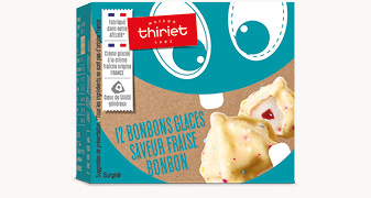 INGRÉDIENTS : Chocolat blanc 24.9% (sucre, beurre de cacao, poudre de lait entier, beurre glacier, émulsifiant : lécithines (soja), arôme naturel de vanille), lait écrémé réhydraté, sucre, crème fraîche 8.5% , sirop de glucose, matière grasse végétale (coprah), purée de fraise 5.1%, dextrose, lait écrémé en poudre, lactose et protéines de lait, amidon de blé, beurre de cacao, lactose, jus concentré de citron, dioxyde de carbone, extraits végétaux : carotte noire - betterave, émulsifiant : mono- et diglycérides d’acides gras, épaississants : farine de graines de caroube - gomme guar, gélifiant : pectine, agent d’enrobage : shellac, arôme naturel, colorants : carmins- anthocyanes - curcumine.
