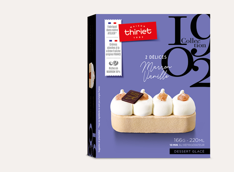 Succombez à la douceur d'une crème glacée marron à la crème fraîche, garnie d'une délicieuse crème glacée vanille, surlignée d'une sauce au marron, de morceaux de marrons glacés et d'un sceau au chocolat.*Tous les ingrédients ne sont pas d'origine France
