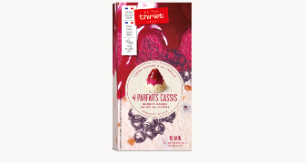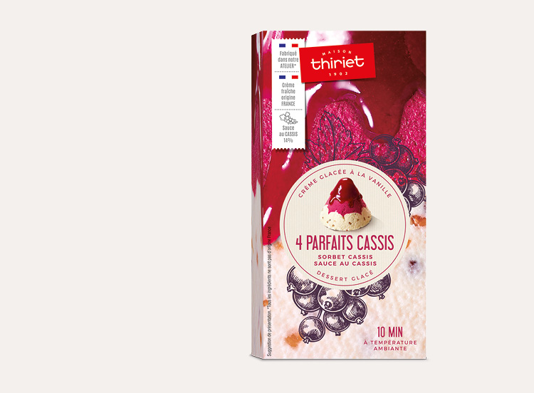 Crème glacée avec morceaux de noisettes caramélisés, sorbet cassis, sauce cassis.*Tous les ingrédients ne sont pas d'origine France