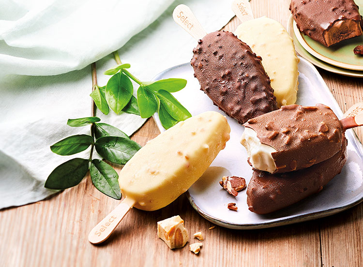CRÈME GLACÉE VANILLE GOUSSE BOURBON A LA CRÈME FRAÎCHE 61.5%, ENROBAGE CHOCOLAT AU LAIT AVEC DES BÂTONNETS D’AMANDES 38.5%.