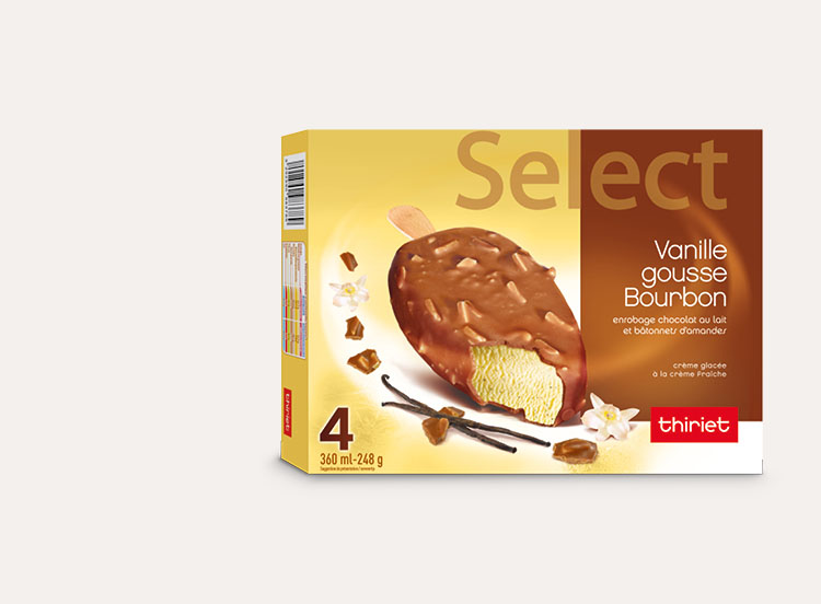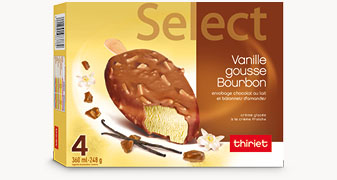 4 bâtonnets gourmands à base de crème glacée vanille gousse, à la crème fraîche, enrobée de chocolat au lait, pur beurre de cacao avec des bâtonnets d'amande croquants. Emballage individuel.*Tous les ingrédients ne sont pas d'origine France