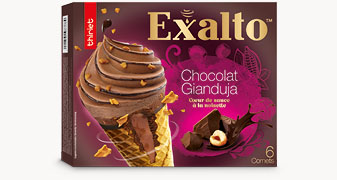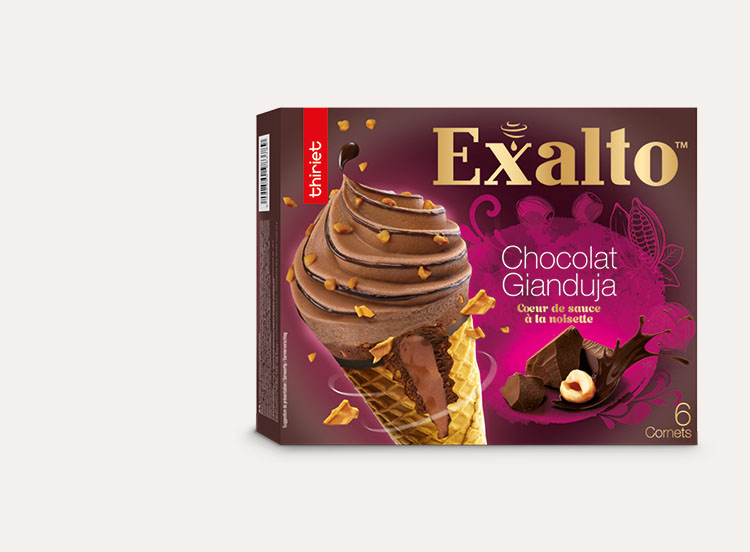 Inconditionnels du chocolat, laissez-vous emporter par l'alliance d'une crème glacée chocolat et ses morceaux de noisettes caramélisés et d’une autre crème glacée chocolat au lait aux noisettes gianduja avec un cœur de sauce fondant à la noisette. Avec Exalto™, succombez à ce tourbillon de saveurs pour une expérience exaltante !*Tous les ingrédients ne sont pas d'origine France