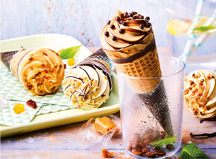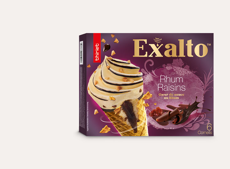CRÈME GLACÉE AU RHUM AVEC DES RAISINS MACÉRÉS 67%, SAUCES AU RHUM ET AU CHOCOLAT RHUM 12%, AU RHUM SAINT JAMES® , GAUFRETTE 13% AVEC NAPPAGE AU CACAO 7%, DÉCOR NOISETTES 1% :