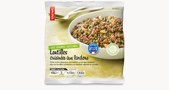Pas toujours le temps de cuisiner des lentilles ? Jambonneaux ou saucisses à cuire vont maintenant trouver leur accompagnement de choix : ces lentilles vertes sont déjà mijotées et agrémentées de lardons, oignons et carottes, ajoutez une touche de crème pour le goût et ce légume sec aiguisera l'appétit de toute la famille.