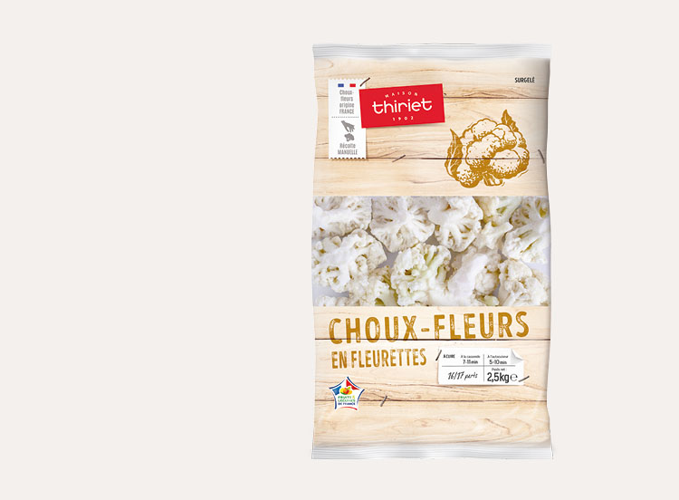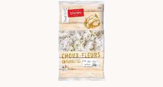 Des choux fleurs en fleurettes origine France, surgelés individuellement prêts à cuire, pour vos accompagnements de viande, poisson, œufs, gratin, ou en vinaigrette relevée de fines herbes.