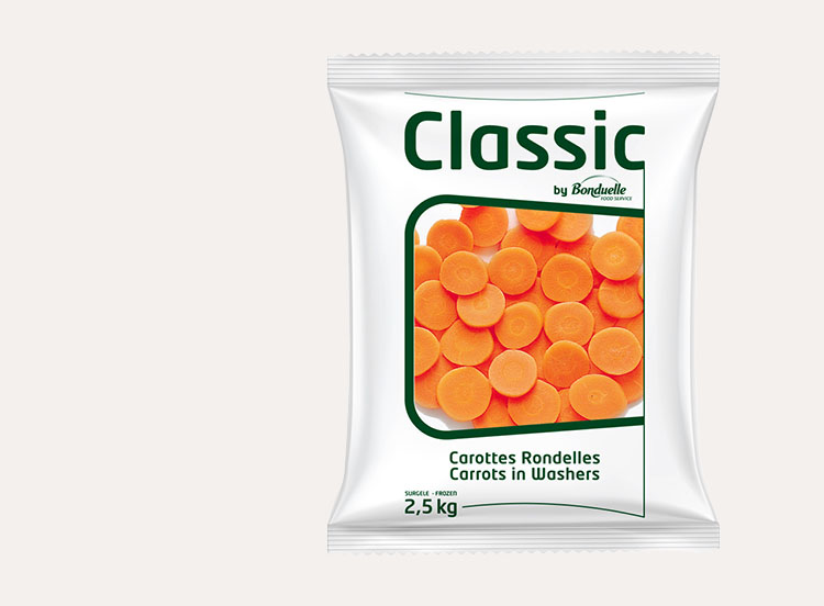 Des rondelles de carottes surgelées individuellement à cuire seules ou à joindre avec d'autres légumes pour la réalisation de jardinières de légumes.