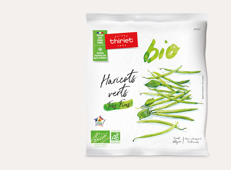 Surgelés maximum 24 heures après la récolte, ces haricots verts très fins cultivés en France sont issus de l'agriculture biologique. Ce mode de production, conformément à la réglementation biologique, minimise l’usage de produits chimiques et