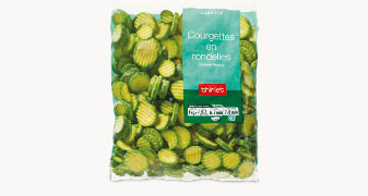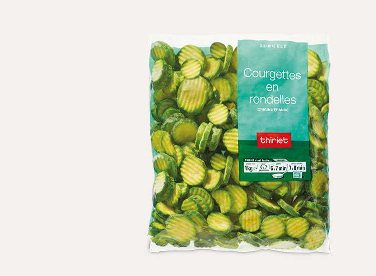 Courgettes en rondelles surgelées individuellement et conditionnées en sachet.
