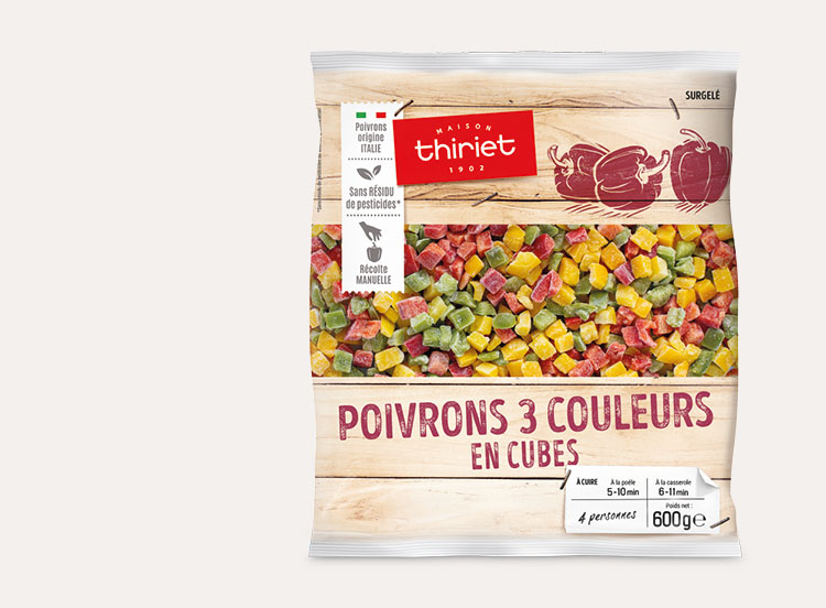 Cultivés en Italie, ces poivrons rouges verts et jaunes déjà coupés mettent du soleil dans vos préparations. La maison Thiriet garantit pour ces légumes l'absence de résidu de pesticides à travers une agriculture plus vertueuse, plus respectueuse de l'environnement et de la biodiversité. (Seuil de quantification < 0,01 mg/kg pour une recherche de 400 molécules minimum.)*La Maison Thiriet développe une gamme de légumes granatissant l'absence de résidu de pesticides à travers une agriculture plus vertueuse, plus respectueuse de l'environnement et de la biodiversité. (Suil de quantification <0.01 mg/kg pour une recherche de 400 molécules minimum.)