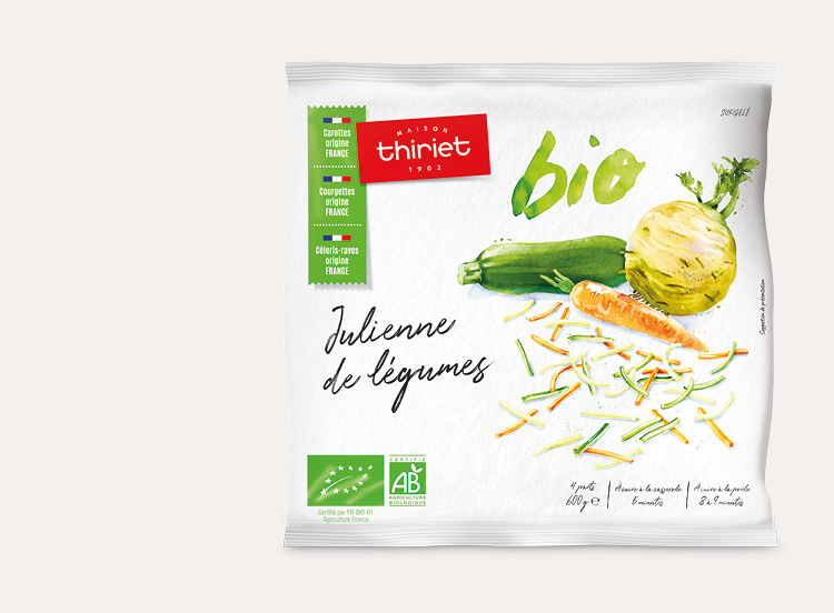 Taillés en julienne, ces carottes, courgettes et céleris-raves biologiques origine France accommodent gaiement vos viandes en sauce, poissons ou noix de St-Jacques. Ils se prêtent à diverses préparations comme des papillotes, aspics ou potages de légumes pour laisser libre court à votre imagination.