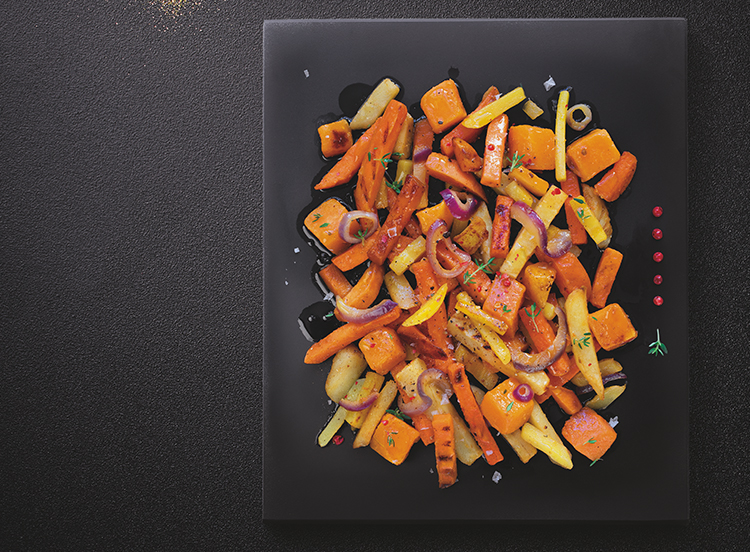 Fondez pour cette poêlée composée de butternut et de panais grillés, de patate douce, de carottes jaunes et d'oignons rouges. Le glaçage au beurre, jus d'orange et miel de ces légumes anciens apporte du brillant et un goût incomparable pour une poêlé prête à être dégustéer. Voilà des légumes qui donnent envie !