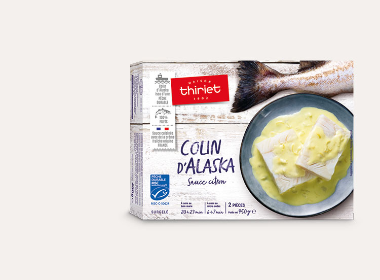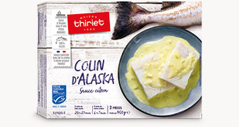 Portion de filets de colin d'Alaska (poisson) 53,3%, eau, crème fraîche (lait) (origine France) 14,9%, échalote 2,9%, amidons transformés, jus de citron concentré 0,7%, fumet de poisson (maltodextrine, sel, farine de blé (gluten (Blé)), poisson en poudre (poisson), céleri-rave (céleri), poireau, oignon, sucre, extrait de levure, crème en poudre (lait), arôme naturel (poisson), huile d'olive, épices et plantes aromatiques, crevette en poudre (crustacés), extrait de vin blanc), zeste de citron 0,4%, vin blanc concentré, sucre, sel, arôme naturel de poivre, thym, curcuma, épices, colorants : curcumine - extrait de paprika - carmins, fécule, maltodextrine