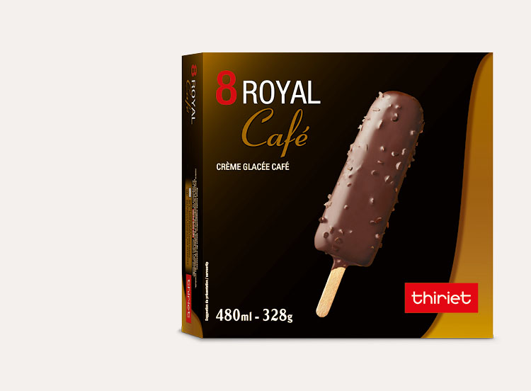 Des bâtonnets de crème glacée café avec extrait naturel de café et enrobage au cacao avec morceaux de noisettes.