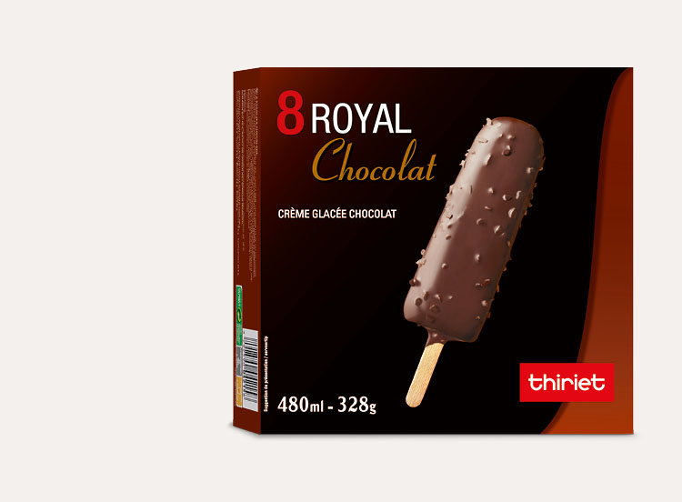 Des bâtonnets de crème glacée chocolat avec enrobage au cacao et morceaux de noisettes.