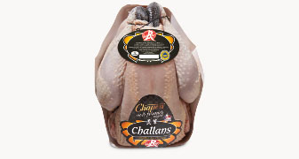 Chapon noir fermier élevé en plein air et certifié Label Rouge de Challans. Alimentation à base de céréales. Volaille prête à cuire, étêtée, éviscérée et sans abats, double bague à l'aile.*Conformément aux CDC Chapon Label Rouge et IGP Volailles de Challans