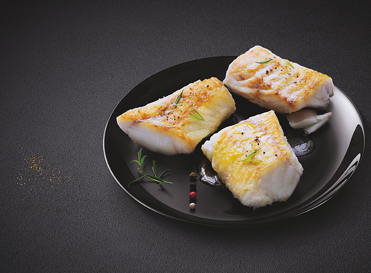 Filets de julienne (Molva molva, poisson) coupés en portions, pêchée au chalut en Atlantique Nord-Est. Présence naturelle d'arêtes.