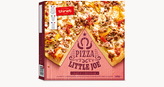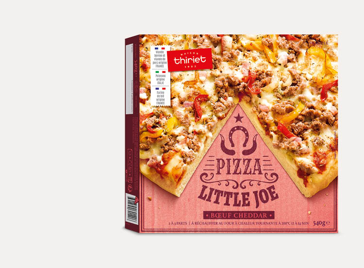 Farine de blé (gluten (Blé)) (origine France) 31,1%, eau, préparation à base de viande bovine cuite assaisonnée 10% (viande bovine cuite (origine France) 9,8%, sel, épices et plantes aromatiques, oignon en poudre), cheddar (lait) 8,3%, bacon cuit choix fumé 3,7% (viande de porc (origine France) 3,5%, sel, dextrose, acidifiant : acide citrique, antioxydant : érythorbate de sodium, conservateur : nitrite de sodium), poivron jaune grillé (origine Italie) 3,7%, poivron rouge grillé (origine Italie) 3,7%, oignon grillé 3,7%, concentré de tomate, oignons préfrits 2,3% (oignon blanc, huile de tournesol), sucre, vinaigre d'alcool, huile d'olive vierge extra, sel, levure, amidon, épices et plantes aromatiques, paprika fumé, sel fumé, purée de piment (piment, sel)