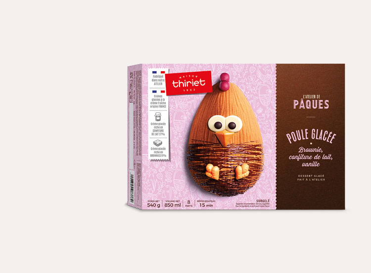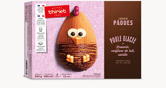 Pour les fêtes de Pâques, savourez en famille la nouvelle création glacée à partager Thiriet ! Une poule glacée savoureuse et gourmande avec trois crèmes glacées onctueuses : confiture de lait marbrée de confiture de lait, façon brownie et morceaux de brownies, vanille avec éclats de caramel, à la crème fraîche origine France. Le tout repose sur une dacquoise à la noisette avec morceaux de noisette, avec décors en confiserie réalisés en chocolat et en pâte d'amandes.