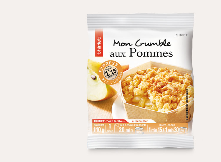 Sortez le crumble de son sachet, déposez-le encore surgelé dans sa barquette sur une assiette. Faites-le réchauffer au micro-ondes à 750W pendant 1 minute 15 à 1 minute 30. Laissez reposer quelques instants avant de déguster.