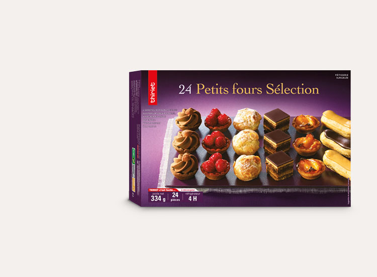 Un assortiment de 24 petits fours composé de : 4 carrés opéra, 4 tartelettes framboise, 4 choux praliné, 4 tartelettes abricot, 2 éclairs chocolat, 2 éclairs café et 4 tartelettes gianduja/noisette.