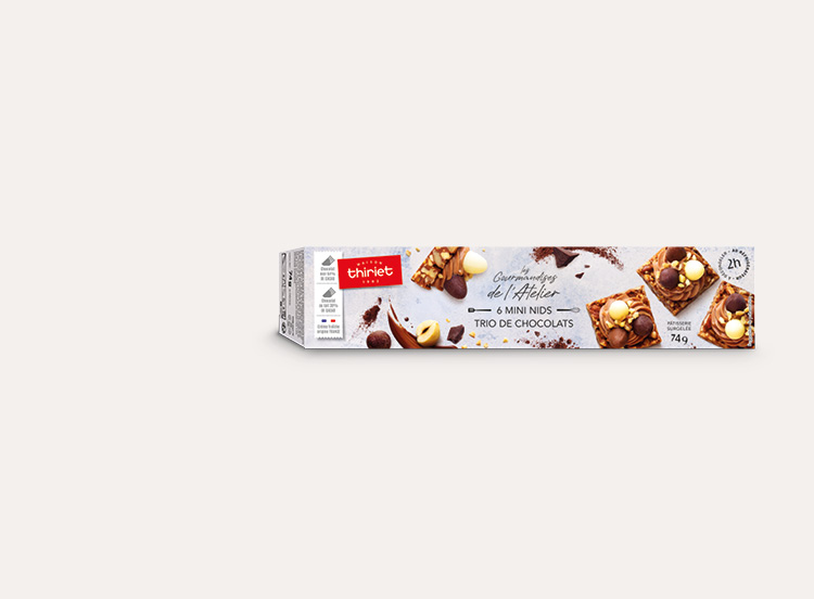 De quoi finir vos repas de Pâques en beauté ! Ces 6 mini nids super gourmands feront plaisir à toute la famille ! L'alliance d'une base aux fruits secs chocolatée - composée de noix de pécan, d'amandes et de noisettes grillées et de chocolat au lait, d'un crémeux au chocolat, de trois petits œufs (un au chocolat noir, un chocolat au lait et au chocolat blanc) et enfin de noisettes grillées hachées.