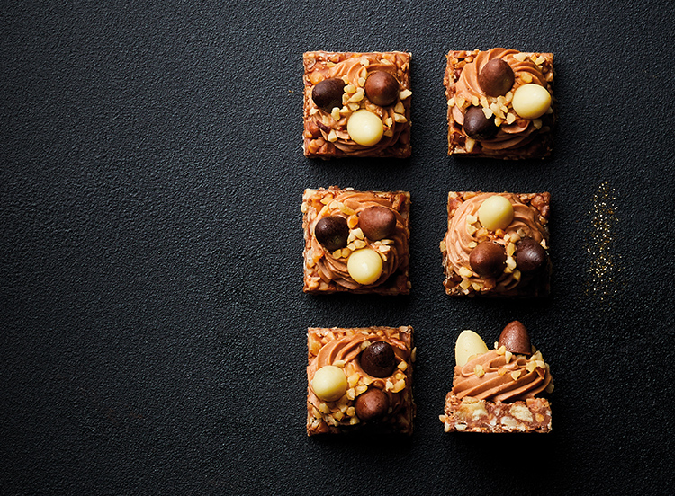 Chocolat couverture lait à 38% de cacao minimum 29,7% (sucre, beurre de cacao, lait entier en poudre (lait), pâte de cacao, arôme naturel de vanille, émulsifiant : lécithines (soja), sel), crème fraîche (origine France) (lait) 11,3%, amande hachée (fruits à coque (Amandes)) 10,6%, noix de pécan (fruits à coque (Noix de pécan)) 10,6%, mascarpone 9,5% (crème de lait (lait), lait (lait), correcteur d’acidité : acide citrique), noisette grillée (fruits à coque (Noisettes)) 7,9%, pâte aux noisettes et amandes 6,4% (sucre, noisette (fruits à coque (Noisettes)) 1,5%, amande (fruits à coque (Amandes)) 1,5%, huile de tournesol, émulsifiant : lécithines (soja)), chocolat de couverture noir à 64% de cacao minimum 4,7% (pâte de cacao, sucre, beurre de cacao, émulsifiant : lécithines (soja), arôme naturel de vanille), chocolat blanc à 29% de cacao minimum 4,7% (sucre, beurre de cacao, lait écrémé en poudre (lait), matière grasse laitière anhydre (lait), émulsifiant : lécithines (soja), arôme naturel de vanille), beurre de cacao, jaune d'œuf de poules élevées en plein air (oeufs), sucre