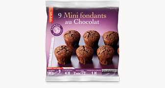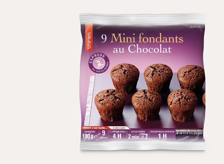 Sortez les mini fondants de l'emballage, répartissez-les encore surgelés avec leur coupelle papier sur une grande assiette. Placez-les au réfrigérateur pendant 4 heures environ. Pour un meilleur moelleux, laissez-les10 minutes à température ambiante avant dégustation,