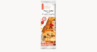 Fruits confits 20.6% (morceaux de bigarreaux, de melon et lamelles d’orange, sirop de glucose - fructose, sucre, correcteur d’acidité : acide citrique, conservateurs : sorbate de potassium - anhydride sulfureux (sulfites), concentrés végétaux : carotte - aronia), farine de blé (agent de traitement : acide ascorbique), œufs entiers frais de poules élevées en pleine air, beurre pâtissier 12.6%, sucre, raisins secs 6.4%, abricots secs 4.1% (agent d’enrobage : farine de riz, conservateur : anhydride sulfureux (sulfites)), rhum 3.1% (colorant : caramel ordinaire), sucre inverti, poudre à lever : amidon - bicarbonate de sodium - acide tartrique, épaississant : gomme xanthane.