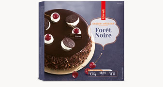 MOUSSE À LA CRÈME FRAÎCHE 37.5%, MOUSSE AU CHOCOLAT 10%, GRIOTTINES® (GRIOTTES A LA LIQUEUR ET COMPOTÉE DE GRIOTTES 18%, GÉNOISES AU CACAO PUNCHÉES 18%, NAPPAGE AU CHOCOLAT 9%, DÉCORS : COPEAUX, CRÈME FOUETTÉE ET SCEAU EN CHOCOLAT 7.5%. INGRÉDIENTS : crème fraîche 31.2%, sucre, eau, chocolat noir 8.1% ( pâte et beurre de cacao, sucre, beurre pâtissier, arôme naturel de vanille, émulsifiant: lécithine (soja)), Griottinessup®/sup 8% (griottes à la liqueur : griotte, sucre, alcool, kirsch), griottes 5.6%, œufs entiers frais de poules élevées en plein air, lait écrémé réhydraté, farine de blé (agent de traitement : acide ascorbique), lait entier concentré sucré (lait entier, sucre), poudre de cacao 1.4%, sirop de glucose-fructose, fécule, kirsch 0,4%, matières grasses végétales (coprah et palme), gélatine bovine, émulsifiants : mono- et diglycérides d’acides gras - esters lactiques des mono- et diglycérides d’acides gras - esters polyglycériques d'acides gras, gélifiant : pectine, épaississant : farine de graines de caroube, jus concentré de fruits rouges, acidifiant : acide citrique, poudre à lever : amidon – bicarbonate de sodium – acide tartrique, beurre de cacao, poudre de lait entier, dextrose, colorants: curcumine – extrait de paprika.