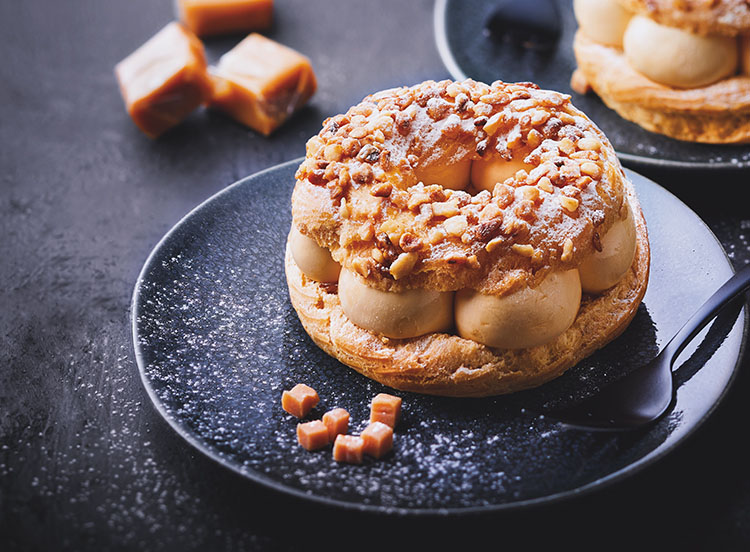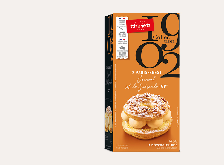 Gourmandise assurée pour cette version caramel ! Le Paris-Brest trouve ses lettres de noblesse avec une pâte à choux pur beurre et aux œufs frais plein air origine France, une mousse onctueuse aucaramel au beurre salé au sel de Guérande IGP* et un coeur crémeux qui intensifie la dégustation.