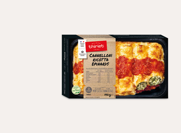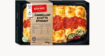 Ricotta (lait) 22,9%, pâtes 17,6% (semoule de blé dur (gluten), eau, œuf de poules élevées en plein air en poudre (oeufs), sel), concassé de tomates 15,4% (tomate, jus de tomate), lait entier en poudre réhydraté (lait) (eau, lait entier en poudre (lait)), eau , épinard haché (origine France) 6,1%, oignon préfrit (oignon, huile de tournesol), crème fraîche liquide (lait) 1,5%, farine de blé (gluten), emmental râpé (lait) 1,2%, jus de citron, concentré de tomate, chapelure (gluten), amidons transformés, sel, basilic 0,3%, huile d'olive vierge extra, beurre doux (lait), ail déshydraté, poivre blanc.