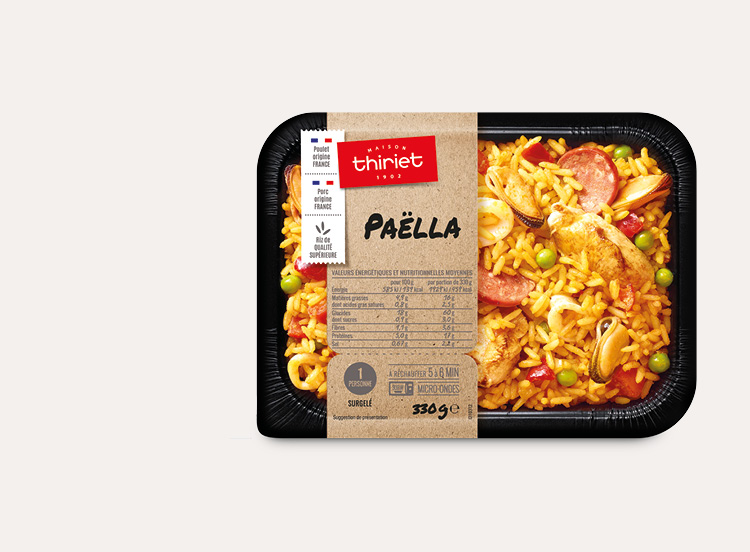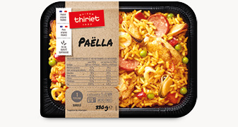 Direction l'Espagne avec cette paëlla pour une personne ! Une recette ensoleillée élaborée avec du riz de qualité supérieure associé à de tendres morceaux de poulet origine France, des fruits de mer (moules et encornets), du chorizo (porc origine France) et des légumes (tomates, poivrons rouges, petits pois et oignons). Buen aprovecho !