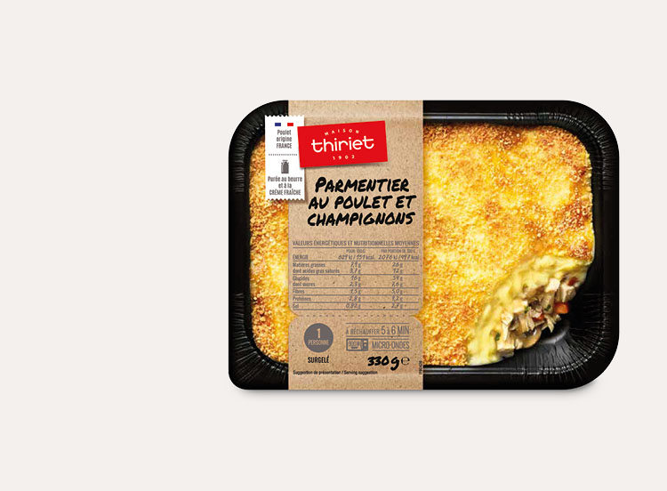 Toute la gourmandise du hachis parmentier dans cette recette revisitée. Une onctueuse purée de pommes de terre au beurre et à la crème fraîche recouvre une farce au poulet (origine France) cuisinée aux champignons et oignons. A déguster en solo !