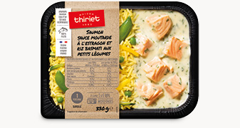 Saumon issu d'une aquaculture responsable et riz basmati aux pois croquants, carottes jaunes, petits pois et courgettes, assaisonnés d'une délicieuse sauce moutarde à l'estragon : un plat haut en couleurs idéal pour une pause déjeuner iodée !