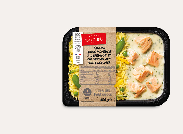Riz basmati cuit 41,3% (eau, riz basmati), crème fraîche épaisse (lait) 17,6%, saumon Atlantique (poisson) 14,5%, carotte jaune 8%, petit pois 5,3%, pois croquant 5,3%, courgette 2,6%, moutarde douce à l'estragon 2,1% (eau, vinaigre d'alcool, graine de moutarde (moutarde), estragon 0,1%, sel, acidifiant : acide citrique, sucre, antioxydant : disulfite de potassium, curcuma, arômes naturels), échalote, huile de tournesol, huile d'olive vierge extra, persil, épices curry (moutarde), épaississant : gomme xanthane