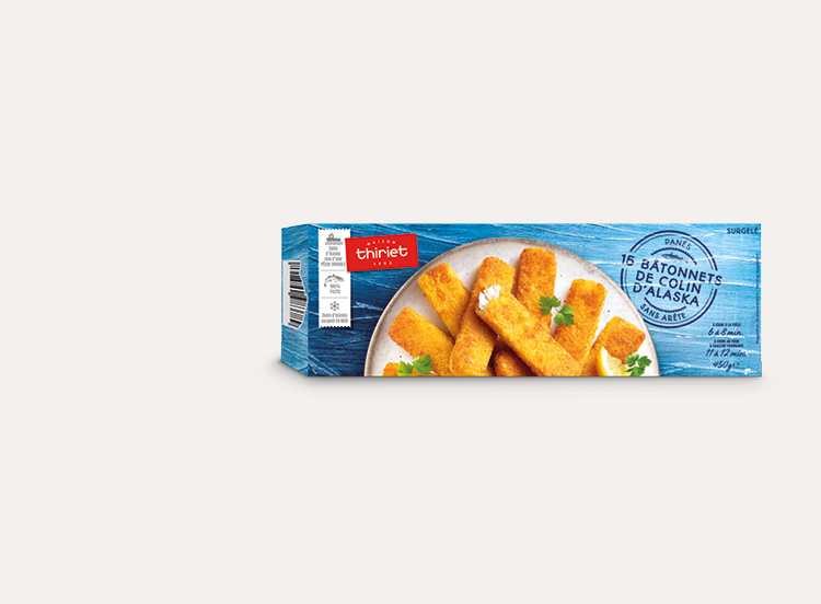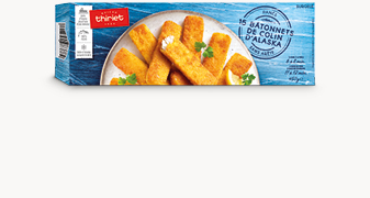 Bâtonnets au colin d’Alaska surgelé en mer, bloc 100% plein filet et qualité sans arêtes, enrobés d’une panure ultra croustillante et préfrits à l’huile de tournesol et huile de colza. Cette dernière est naturellement riche en oméga 3, reconnus pour favoriser le bon fonctionnement du système cardiovasculaire.