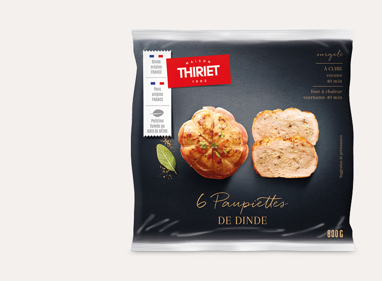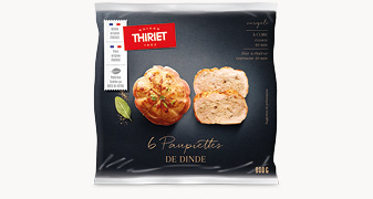 Des paupiettes de dinde composées d'escalopes de dinde origine France et d'une farce à la dinde origine France et entourées d'une tranche de poitrine fumée au bois de hêtre. une format généreux pour une dégustation gourmande.