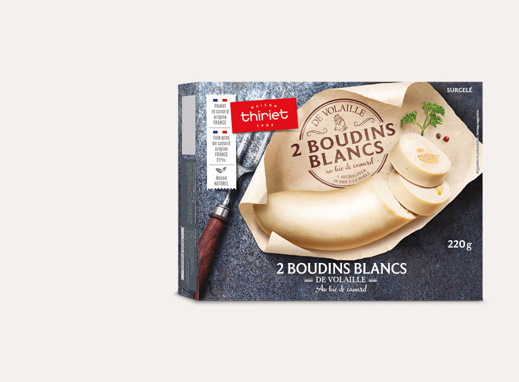 Dans une poêle chaude avec de la matière grasse, dorez les boudins blancs décongelés à feu moyen à couvert, en retournant régulièrement pendant 20 minutes environ.