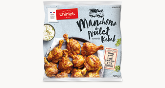 Manchons de poulet (volaille française), épices et plantes aromatiques (cumin, paprika, coriandre, ail, fénugrec, origan, poivre noir, piment, extrait d’oignon), amidon transformé, protéines de soja(soja) sirop de glucose, sel, arômes naturels, tomate, huile de tournesol.