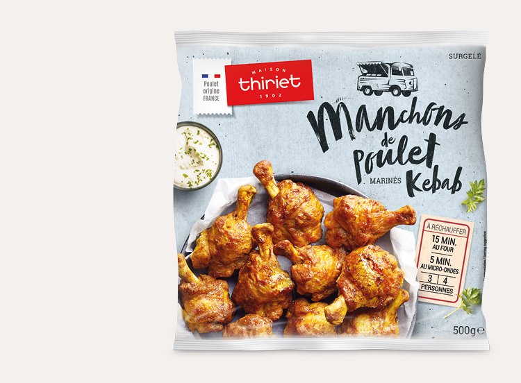 Des manchons de poulet marinés « Kébab » cuits et rôtis. De la viande tendre et moelleuse, à la peau légèrement croustillante.