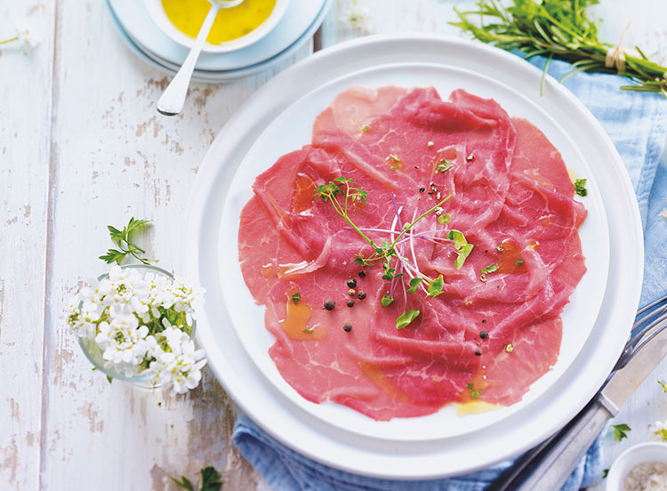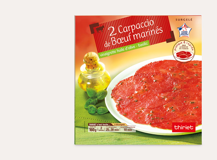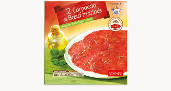 Ouvrez le sachet. Sortez les carpaccio encore surgelés. Otez la première feuille de papier et déposez le carpaccio dans l’assiette de présentation (côté sans feuille contre l’assiette). Décollez délicatement la deuxième feuille de papier. Filmez l’assiette et placez-la 25 à 30 minutes au réfrigérateur.