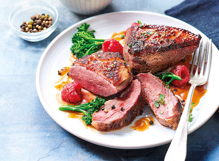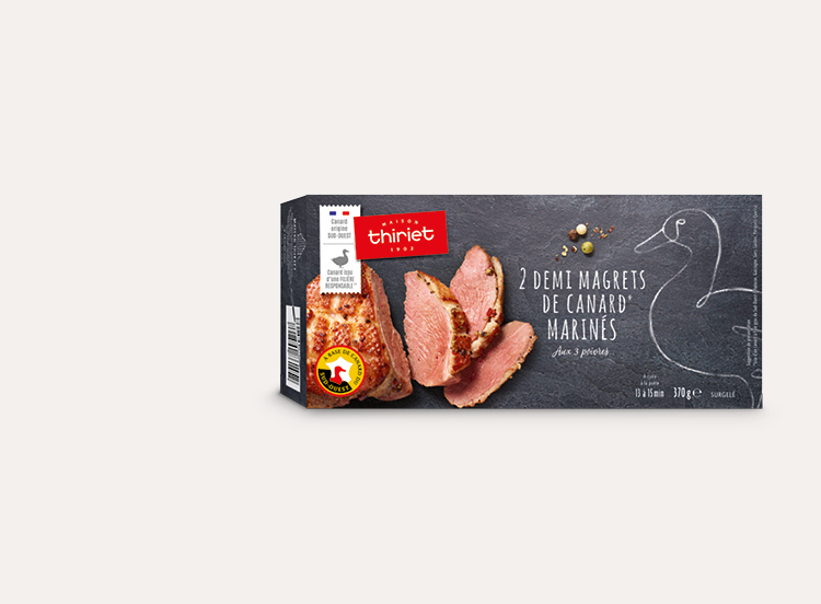 2 demi magrets de canard, origine Sud-Ouest, marinés aux 3 poivres.