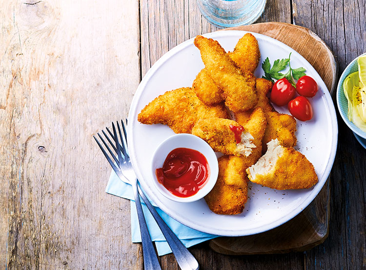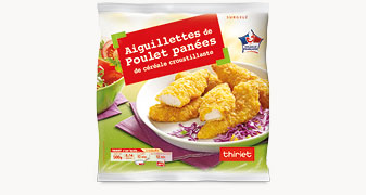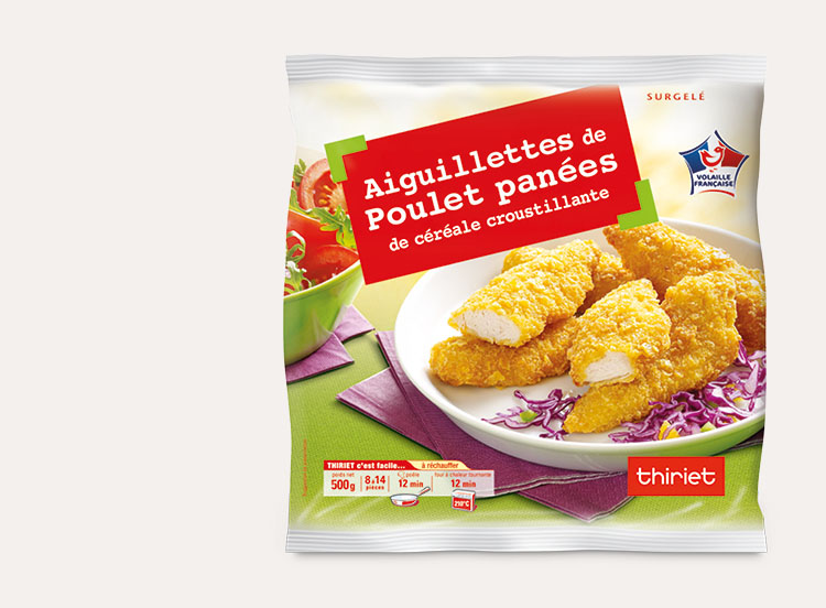 Des aiguillettes de poulet entières très tendres enrobées d’une panure de céréale croustillante, frites et cuites, à réchauffer