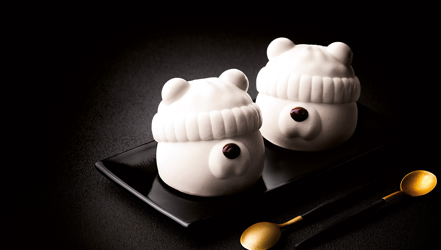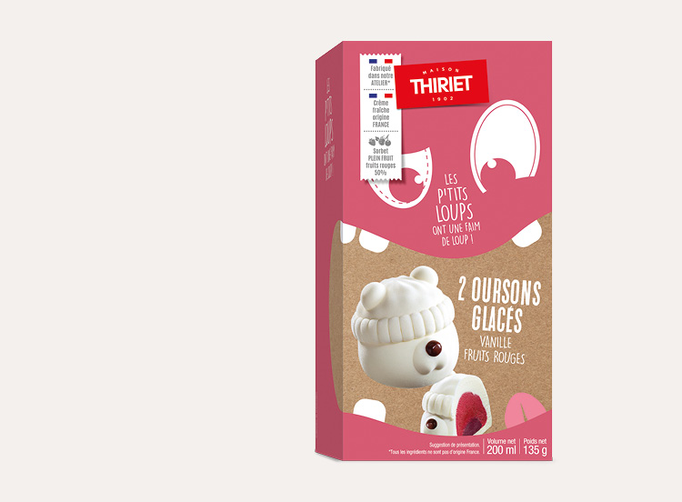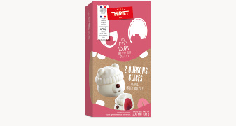 Des petits oursons glacés si mignons ! Les enfants vont les adorer ! Une crème glacée vanille onctueuse à la crème fraiche origine France, un sorbet plein fruit fruits rouges et une sauce fruits rouges.