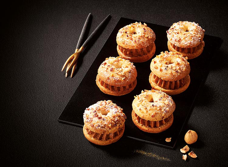 Dénomination de vente : Produit surgelé. 6 petits entremets composés d'une garniture au praliné aux noisettes et amandes (59%), de pâte à choux aux amandes hachées grillées (39%) et d'un décor
