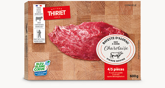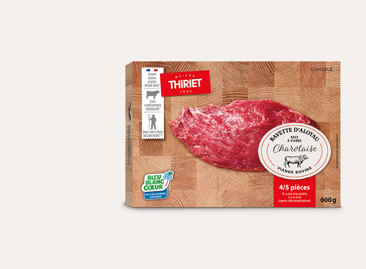Animaux nourris avec des végétaux dont des graines de lin naturellement riches en Oméga 3, produit contrôlé Bleu-Blanc-Cœur. Bavette d’aloyau, de race traditionnelle Charolaise, tranchée à la main et emballée sous vide. Viande aux fibres longues qui donnent une texture tendre et savoureuse. Viande bovine certifiée VBF (Viande Bovine Française), avec un bœuf 100% filière Maison Thiriet.