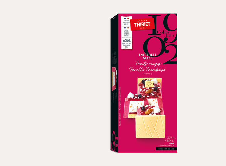 Découvrez un dessert glacé aux contrastes irrésistibles : un sorbet plein fruit fruits rouges accompagné d’une gelée de framboise acidulée, associés à une crème glacée vanille à la crème fraîche (origine France) avec éclats d’amandes caramélisés. Le tout repose sur un biscuit amande avec éclats de praliné. Des plaques de chocolat blanc décorent ce dessert. Un entremets glacé élégant et raffiné, fabriqué dans notre atelier des Vosges, à partager à tout moment de l’année.