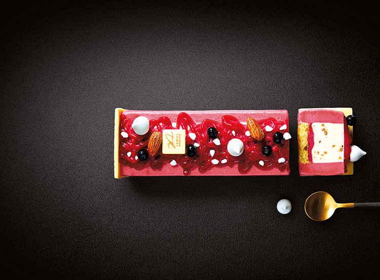 Dénomination de vente : Produit surgelé. Sorbet Plein Fruit fruits rouges et gelée de framboise 51%, crème glacée vanille à la crème fraîche avec éclats d'amande caramélisés 33%, plaques en chocolat blanc et décors 8,5%, biscuit amande avec éclats de praliné 7,5%.