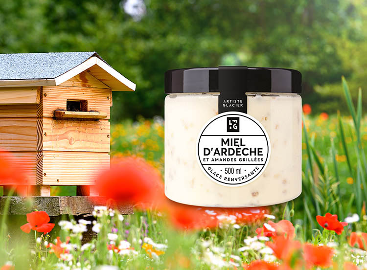 Une crème glacée artisanale au miel de fleurs, récupéré directement chez notre apiculteur transhumant d'Ardèche. Pour y apporter de la texture en bouche, le chef Jérémie ajoute des éclats d'amandes torréfiées. Résultat : une crème glacée tordante !