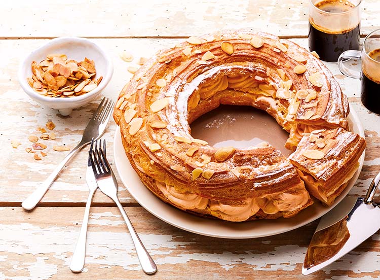 Une couronne de pâte à choux saupoudrée d’amandes effilées et garnie d‘une onctueuse mousse au praliné.